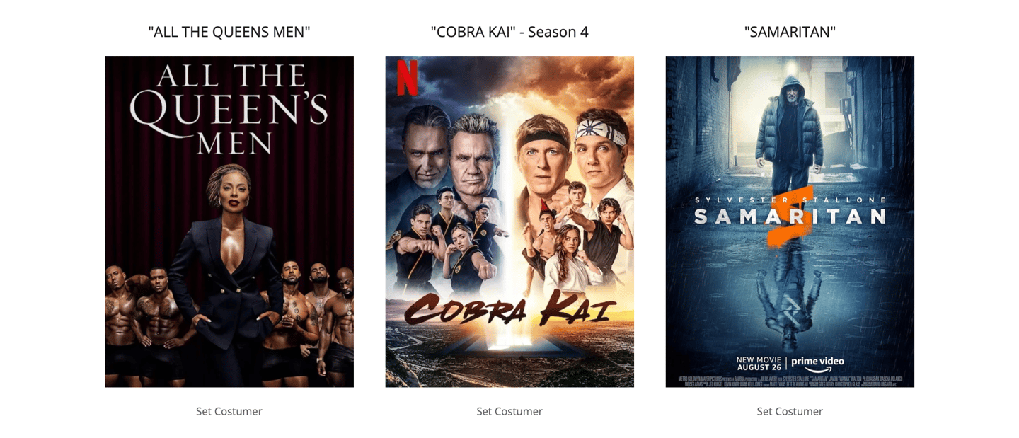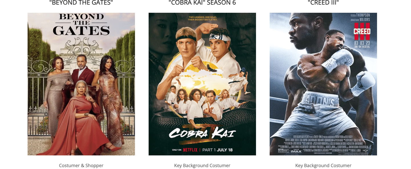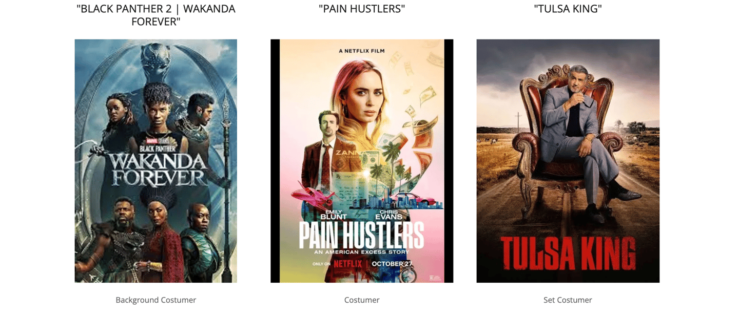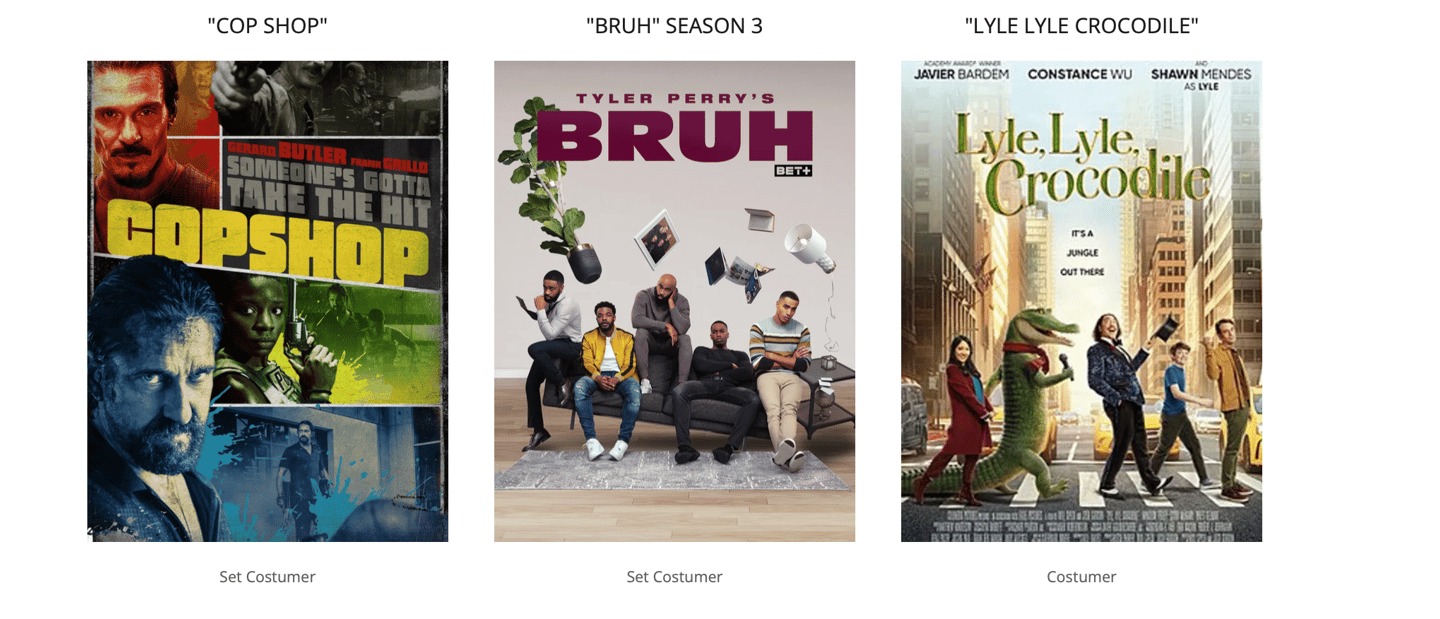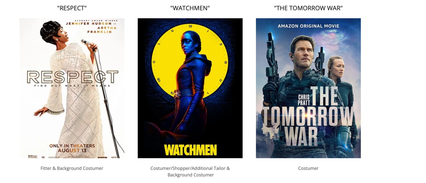 A selection of global box-office productions showcasing my experience across the wardrobe department. From design and shopping to on-set costuming, master tailoring and garment construction.